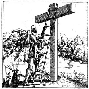 from the nails, she frees and takes the body from the wood