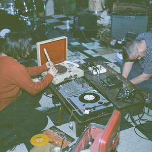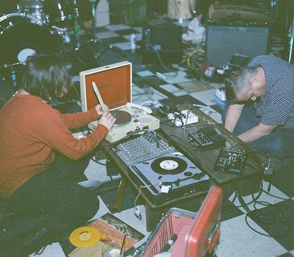 New Yorker portable 78 metal turntable pressed with metals, broom, glass, wooden shim, Numark turntable & various decaying private press & library reference records, samples, percussion