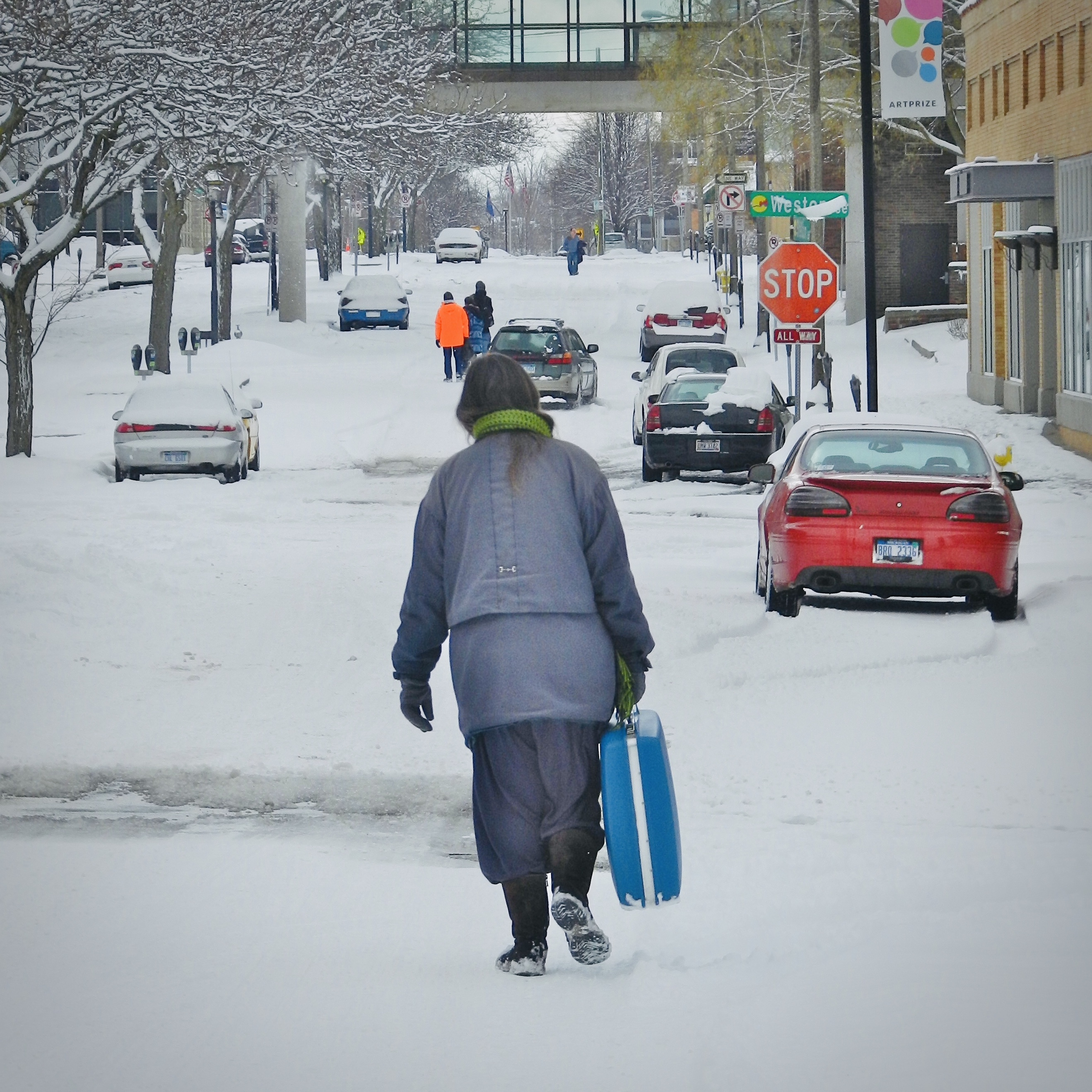 Photo taken by Sarah in Michigan of an unknown traveler with blue suitcase.