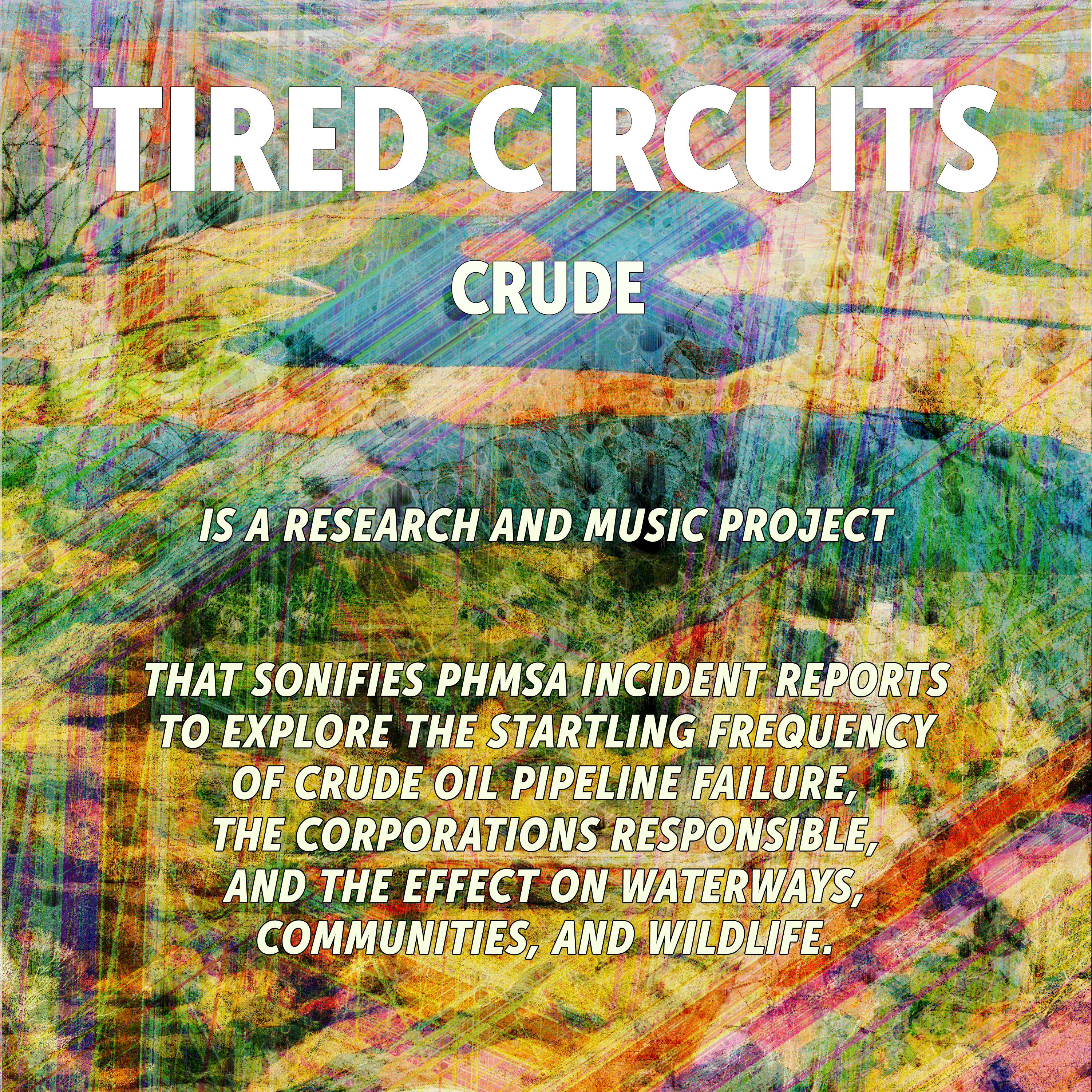 Tired Circuits’ Joshua Dumas created custom code to sonify eight PHMSA incident reports, mapping data to aural elements like distortion, pitch, and waveform to build noisy soundscapes. He then composed melodies and rhythms atop those soundscapes while looking at images of the affected towns and waterways.